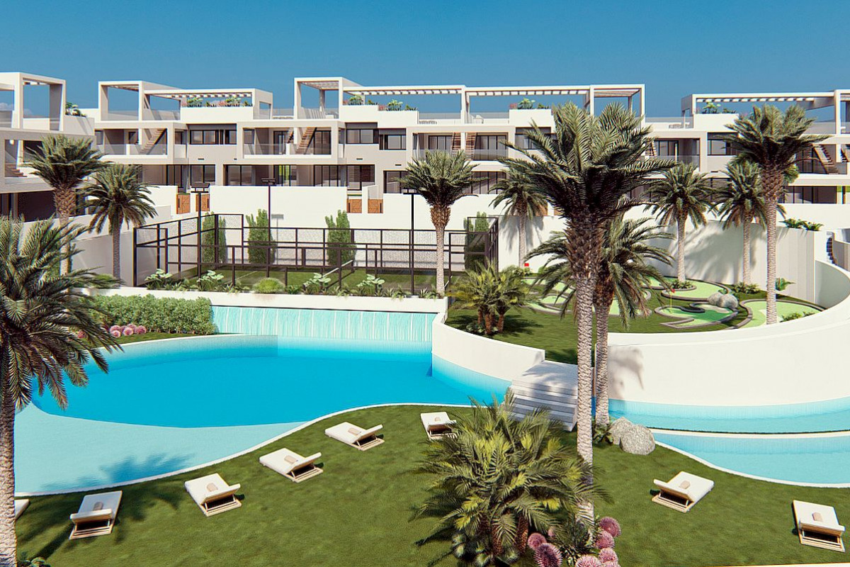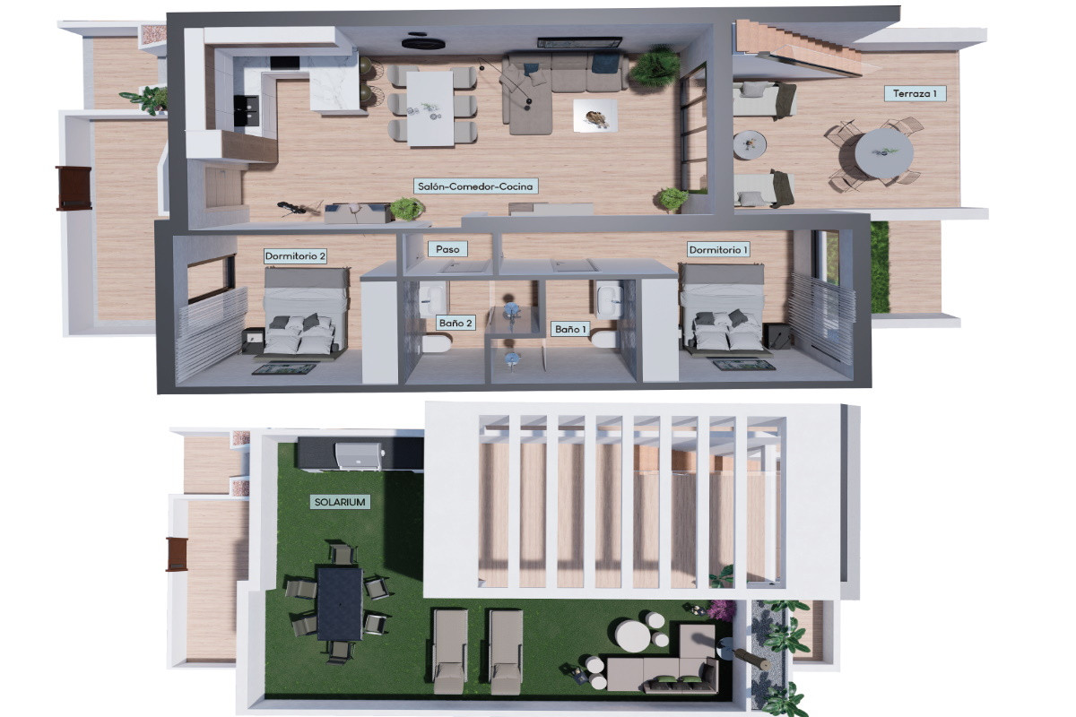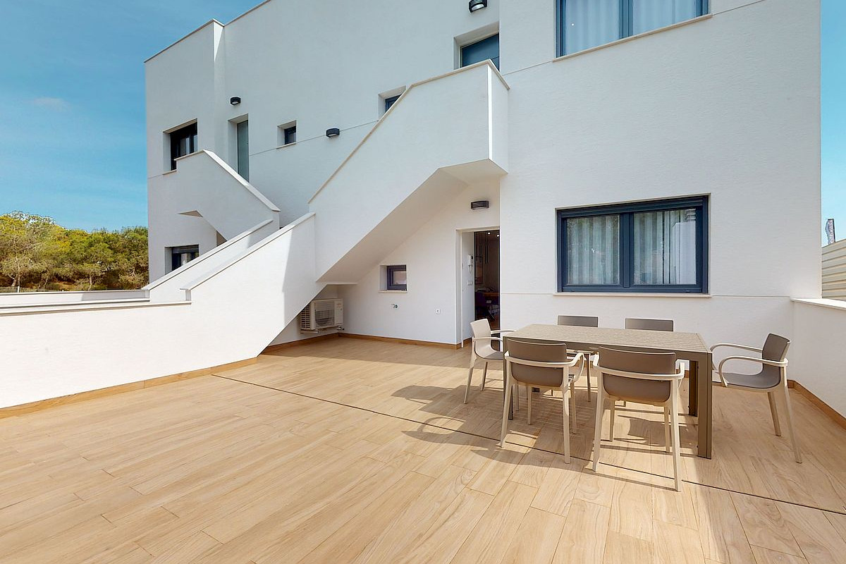 The houses have more than 131m2 distributed in a spacious living-dining room with open kitchen, two large bedrooms and two bathrooms. You have the option of a ground floor maisonette with two large private terraces to enjoy the climate of the Costa Blanca, or top floor maisonettes of 178m2 with a solarium of 85m2 with panoramic views of the Laguna Rosa and the Mediterranean Sea.