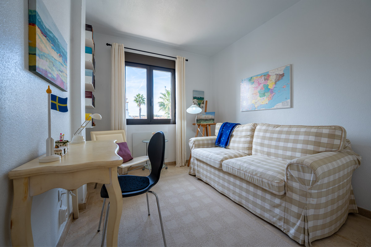 Within the gated community, residents enjoy access to a beautiful communal pool, large garden areas, secure parking, bicycle storage, and a communal solarium with sea views.