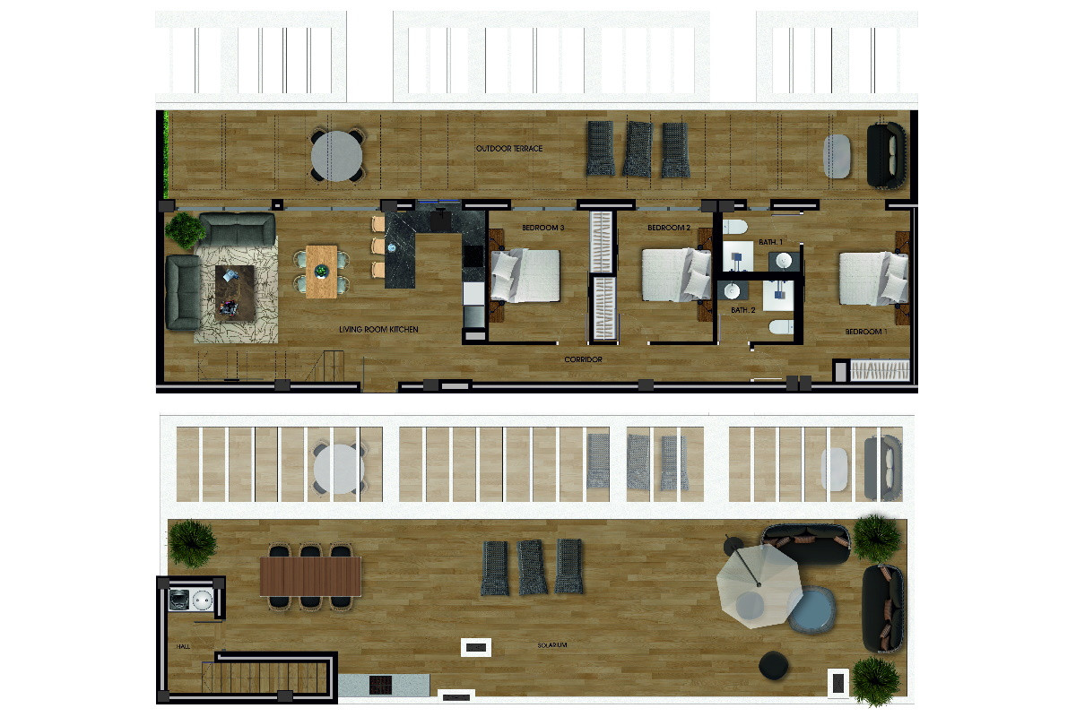 These apartments have the option of two or three bedrooms and two bathrooms, living room with open kitchen and terrace. The ground floor apartments will have a large terrace and garden, and those on the 2nd floor with large private solarium.
