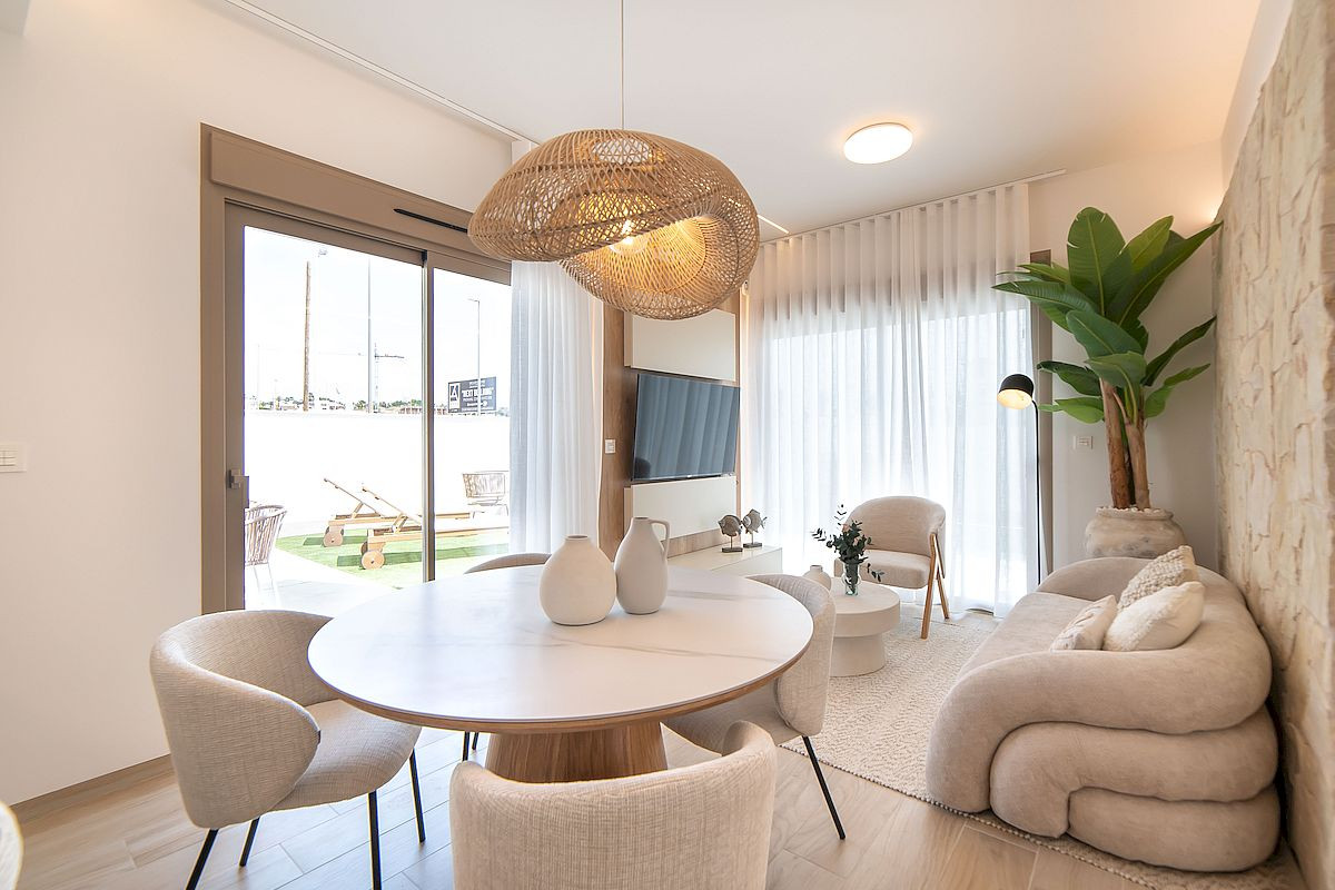 These modern properties, distributed over two floors, consisting on 3 bedrooms with fitted wardrobes, 2 bathrooms, guest toilet, open plan kitchen with the lounge area, solarium with summer kitchen and garden with private pool.
