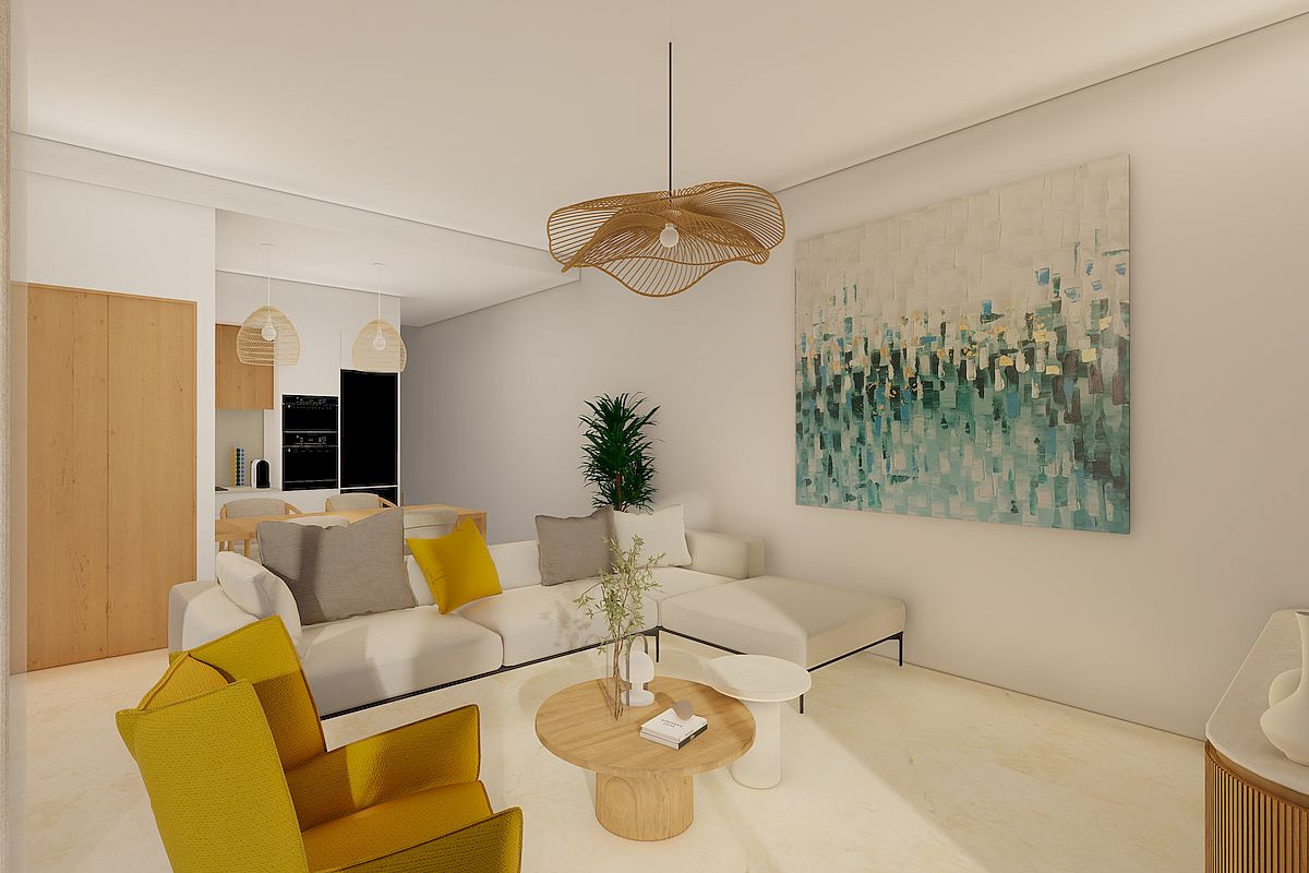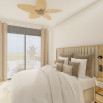 The villas have elegant and functional interiors, ground floor open plan living-dining room and kitchen with all electrical appliances, with large sliding glass door to the terrace from the living room and bedroom. On first floor there are two double bedrooms master with en-suite and access to the balcony through glass patio doors and a further bathroom. Depending on property, also access to the large solarium with summer kitchen.