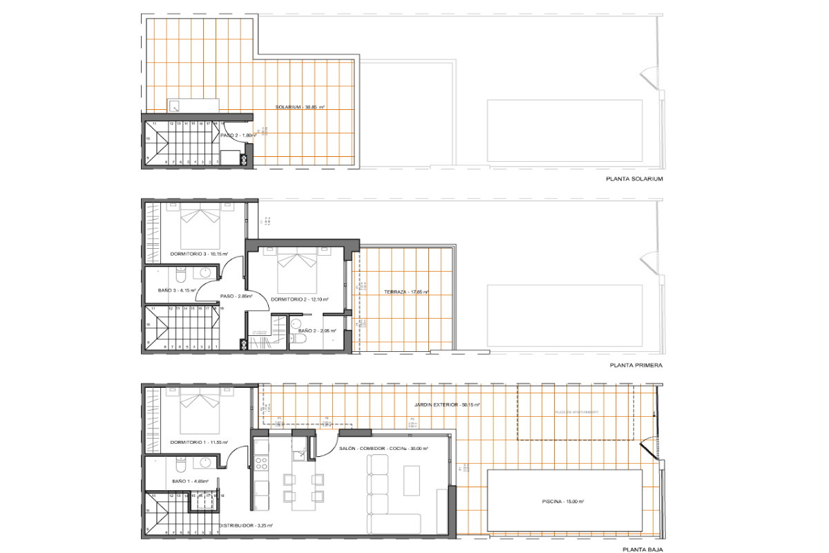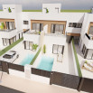 This development is designed with12 semi-detached villas with 3 bedrooms and 2 or 3 bathrooms on two levels, including private swimming pool 15m2, terrace 17.85m2 and solarium 36.85m2 with summer kitchen in selected properties.