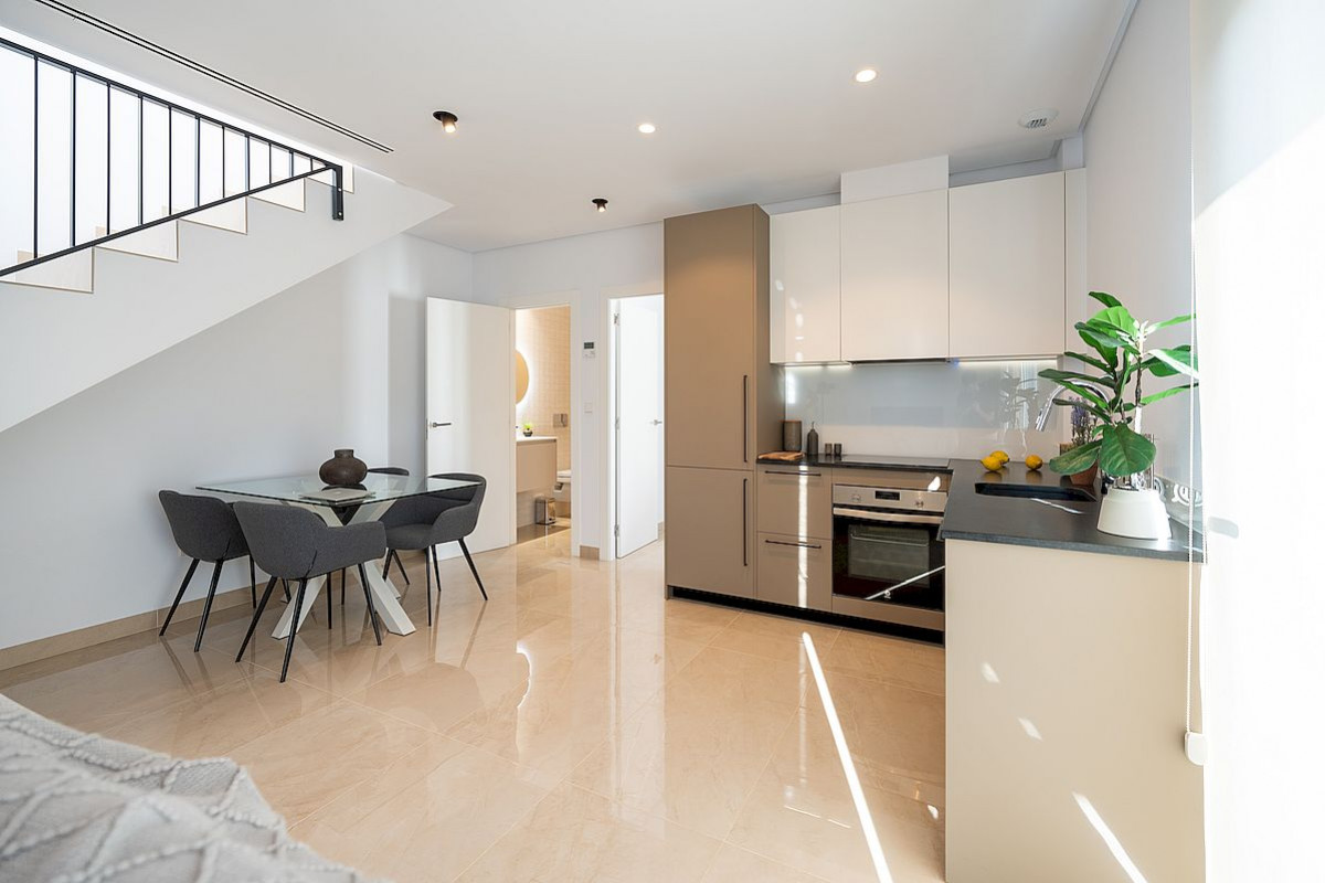 These two-storey properties comprise of three bedrooms (the master with access to a private terrace, all with fitted wardrobes), three bathrooms, fully-fitted modern kitchen (including white goods) and open-plan living/dining area, leading to the private garden and parking space.