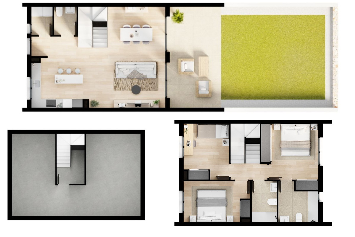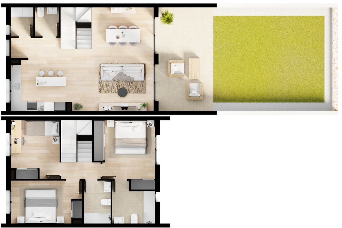 The townhouses feature a modern and functional open-plan design. The ground floor integrates the kitchen with the living-dining area, creating a spacious and bright environment, along with a guest toilet. The upper floor houses the double bedrooms and full bathrooms, designed to provide comfort and privacy for the whole family.