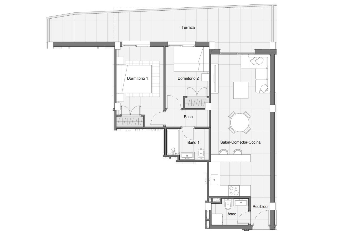 All units include a terrace, an open- plan living-dining room with an open-plan kitchen, a bathroom and toilet, and two bedrooms with built-in wardrobes, creating cozy and functional spaces. The ground floor stands out for its large terraces, while the apartments on the third floor have a private rooftop solarium, ideal for enjoying the sun and the views and creating a unique setting for relaxing and enjoying the landscape.