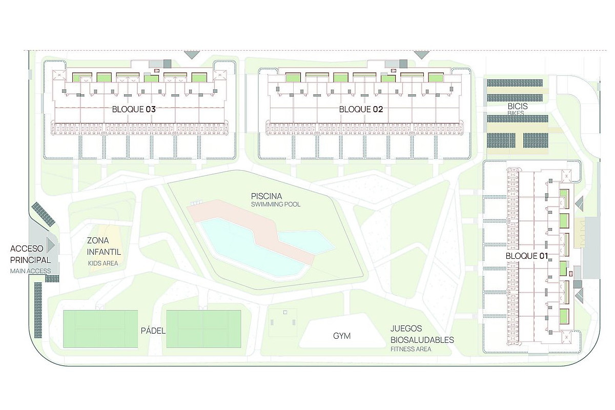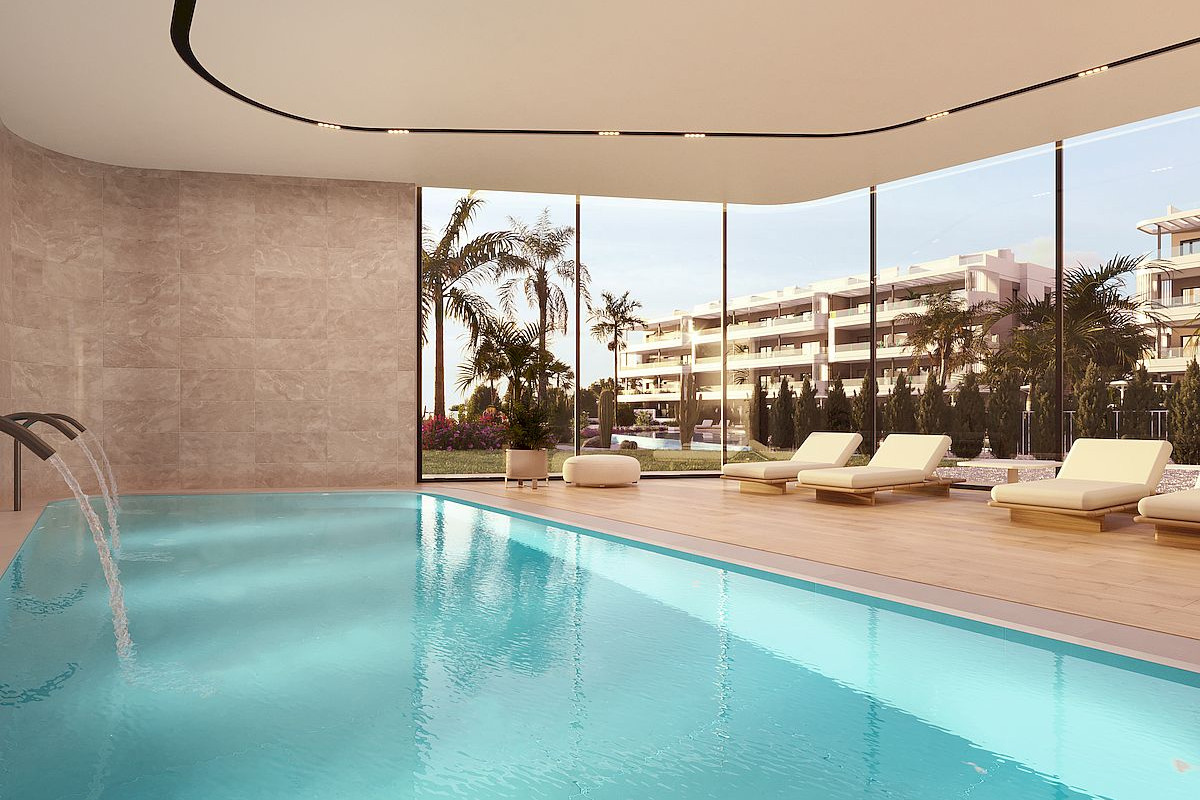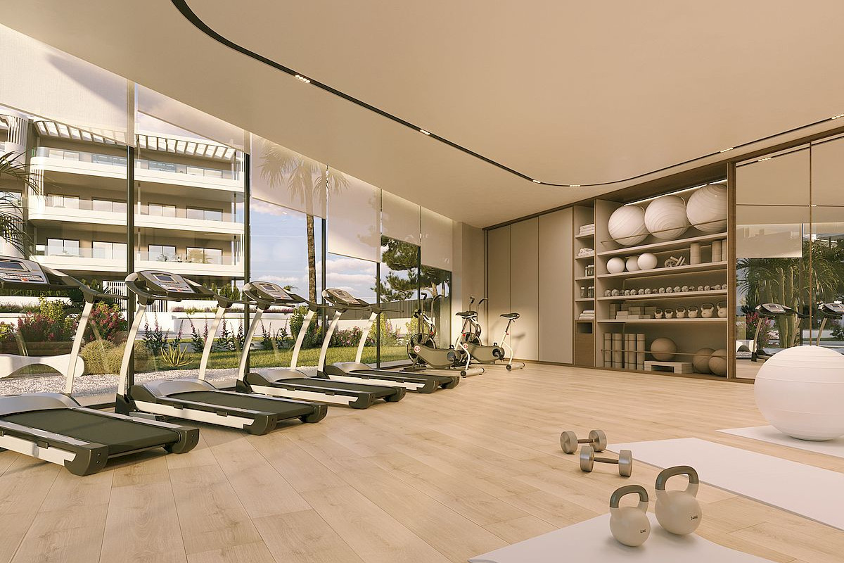 New residential development of 2 and 3 bedroom apartments close to all amenities in La Hoya, Torrevieja, within a residential complex that includes a gym, spa, sauna, communal pools, paddle courts, underground parking and storage rooms.