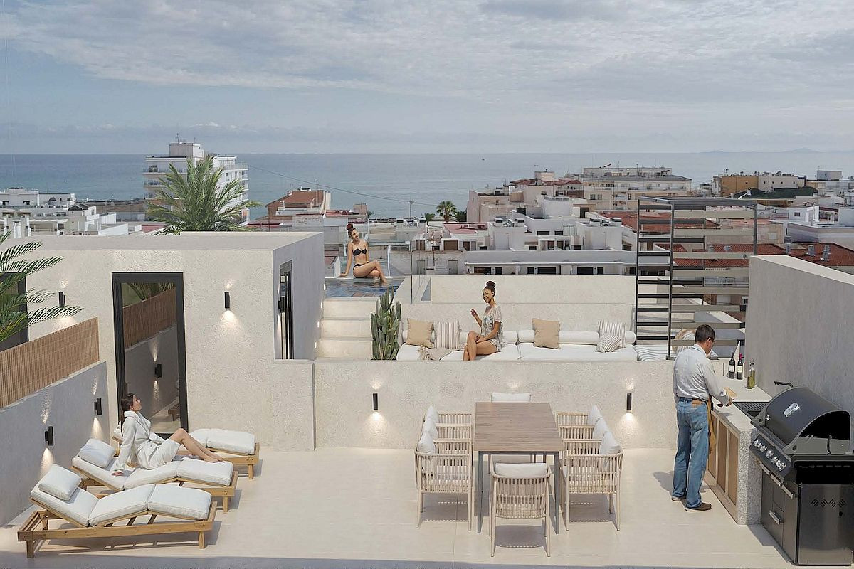 Residents can enjoy a spectacular rooftop communal area featuring a swimming pool, sunbathing spaces with loungers, and landscaped zones, a peaceful retreat for summer relaxation designed for comfort and social living.