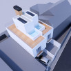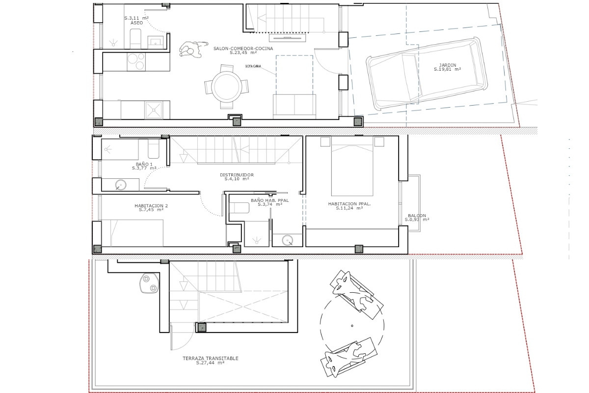 Each townhouse is distributed over two floors plus a private rooftop solarium with open views of the Mediterranean Sea. The ground floor features a bright open plan living dining area with kitchen space, a full bathroom and direct access to a private garden. On the first floor, the sleeping area includes a spacious master bedroom with en suite bathroom, a second single bedroom and an additional full bathroom. The top level is dedicated to a private solarium, an exceptional space to enjoy the sea views, sunbathe year round or create a chill out area for outdoor living.