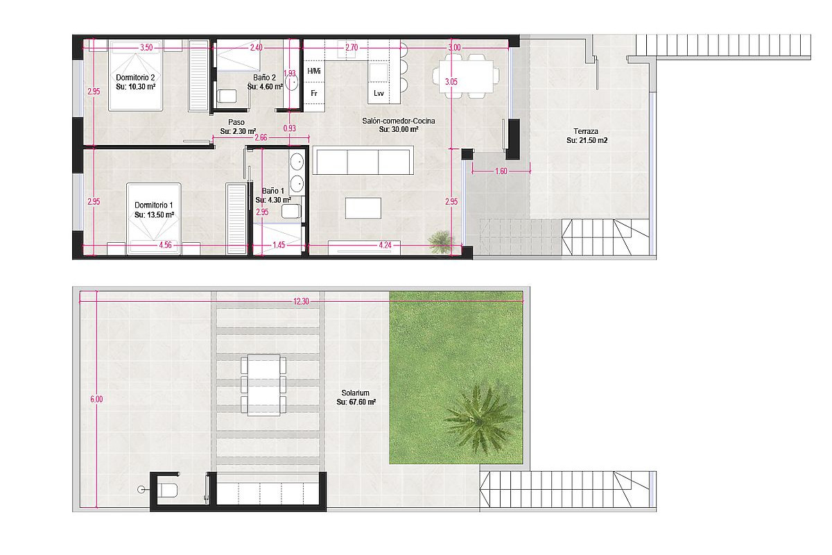 The ground floor maisonettes with 2 bedrooms have generous gardens, ideal for spending time outdoors and organizing gatherings with family and friends. On the other hand, the upper floors with 2 bedrooms feature spacious solariums that allow you to make the most of the sunlight and views of the natural environment.