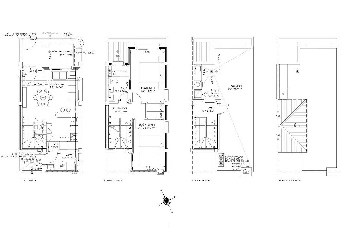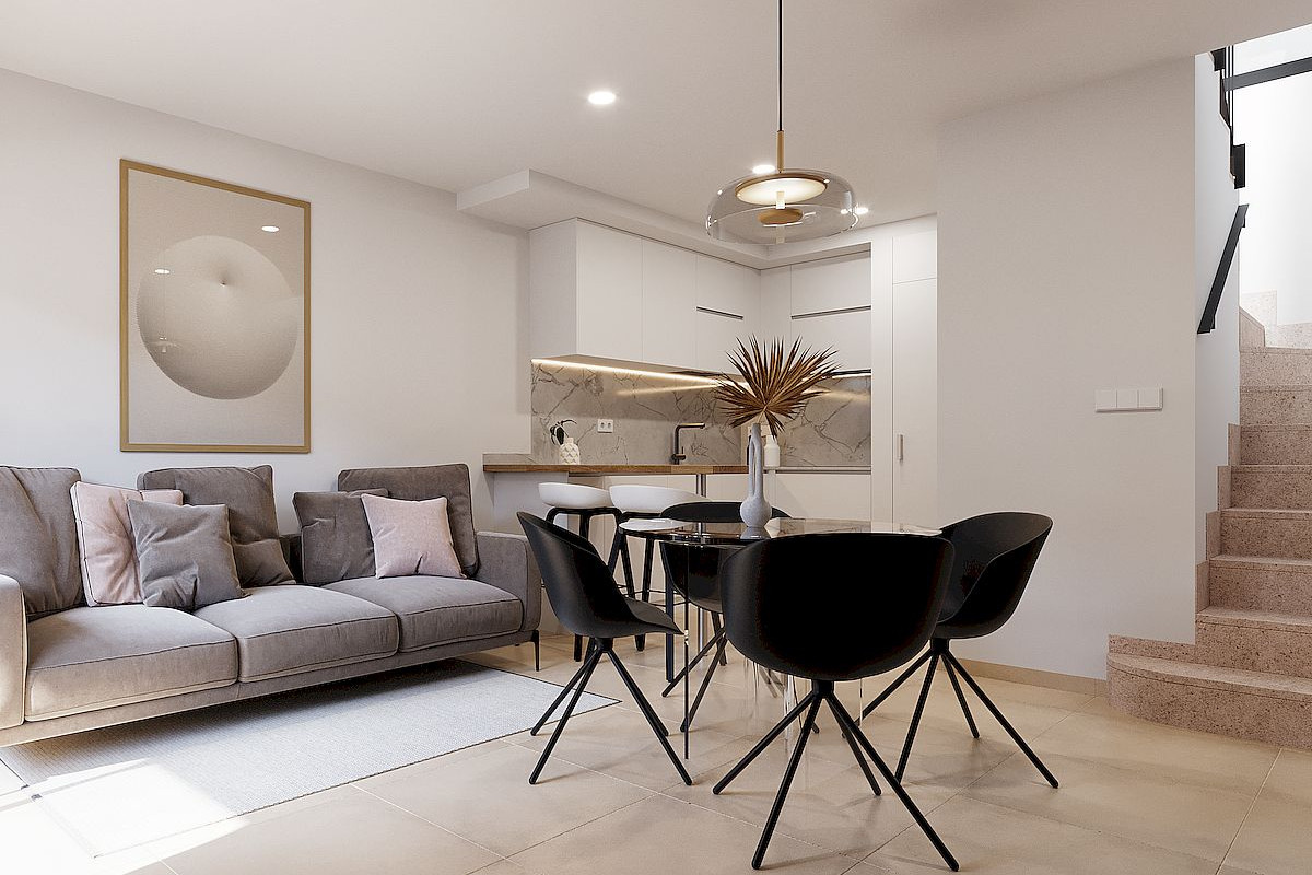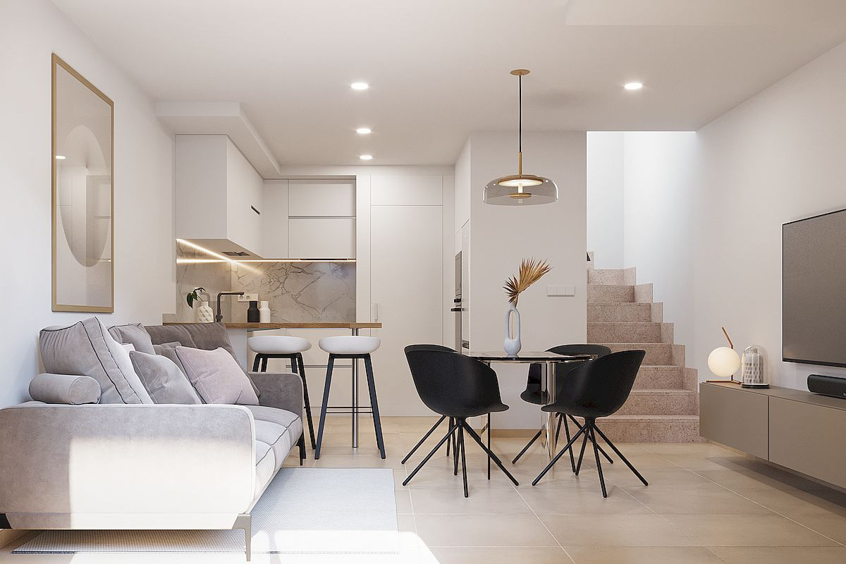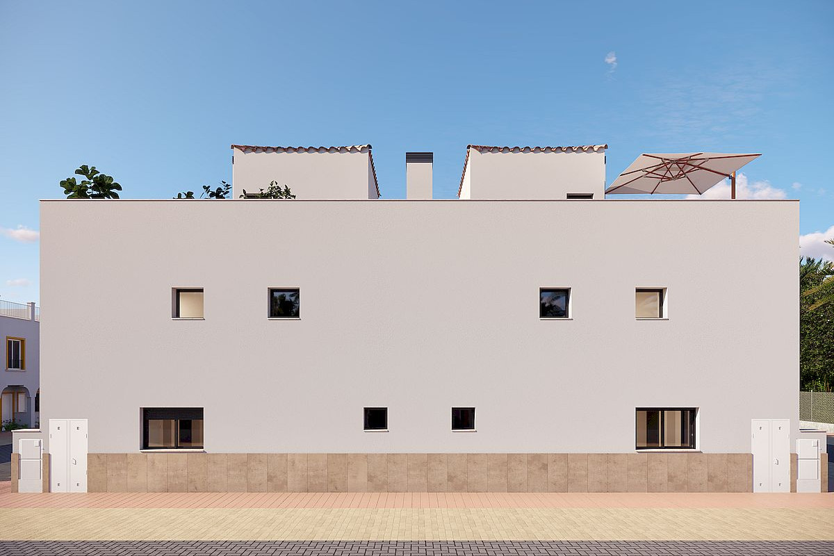 The development consists of townhouses with 2 or 3 bedrooms and 2 bathrooms, designed with a contemporary open plan layout. Each home features a bright living and dining area connected to a fully fitted kitchen with appliances, creating a functional and comfortable living space. All properties include a private rooftop solarium with a summer kitchen, ideal for enjoying the Mediterranean climate, entertaining guests or relaxing outdoors throughout the year. In addition, each home benefits from a private parking space and a storage room located in a communal garage.