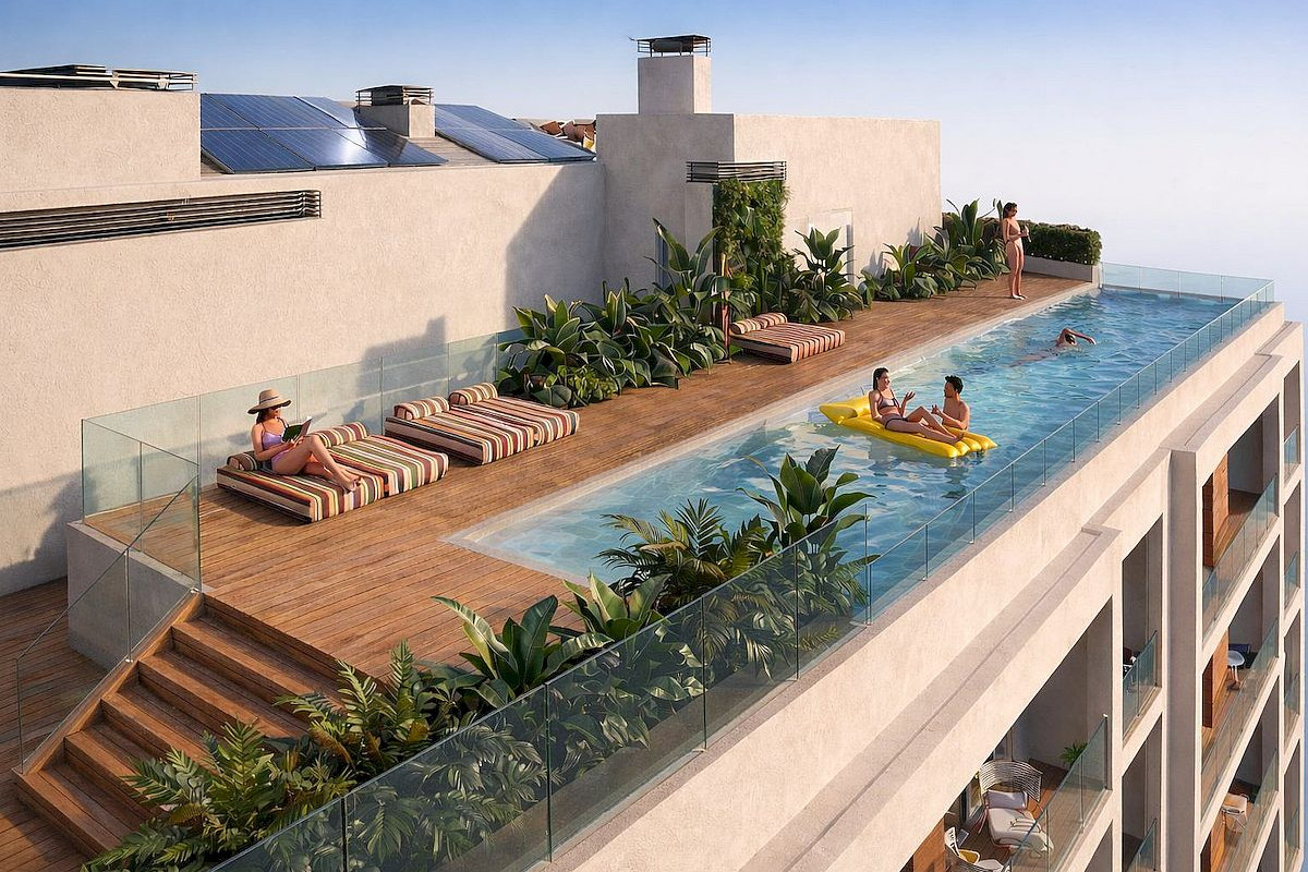 Owners will enjoy a modern building equipped with elevator and magnificent rooftop swimming pool with a spacious sun lounger and relaxation area.
